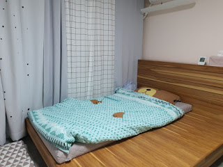 예전에 쓰던 나무 프레임도 같이 버릴까 하다가 반려견을 위해 놓아주기로 했어요.아이는 슈퍼싱글 매트리스 위에서 자고, 개는 시원한 원목 프레임 위에서 자면 좋을 것 같았으니까.
